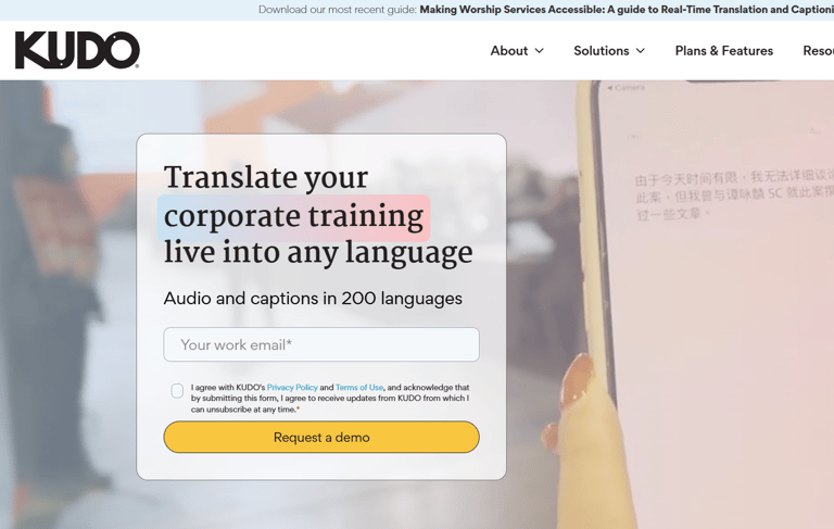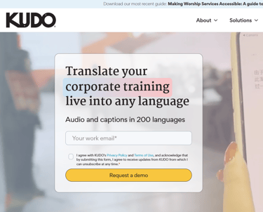 KUDO is an innovative multilingual web conferencing platform equipped with both human and Al- powered live interpretation capabilities. Seamlessly deliver real-time interpretation to enhance the quality of your conferences. The KUDO interpreter marketplace offers a streamlined booking process, granting you convenient access to a vast network of interpreters available on-demand.