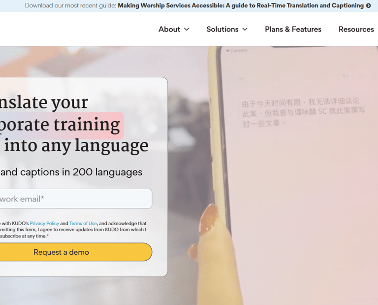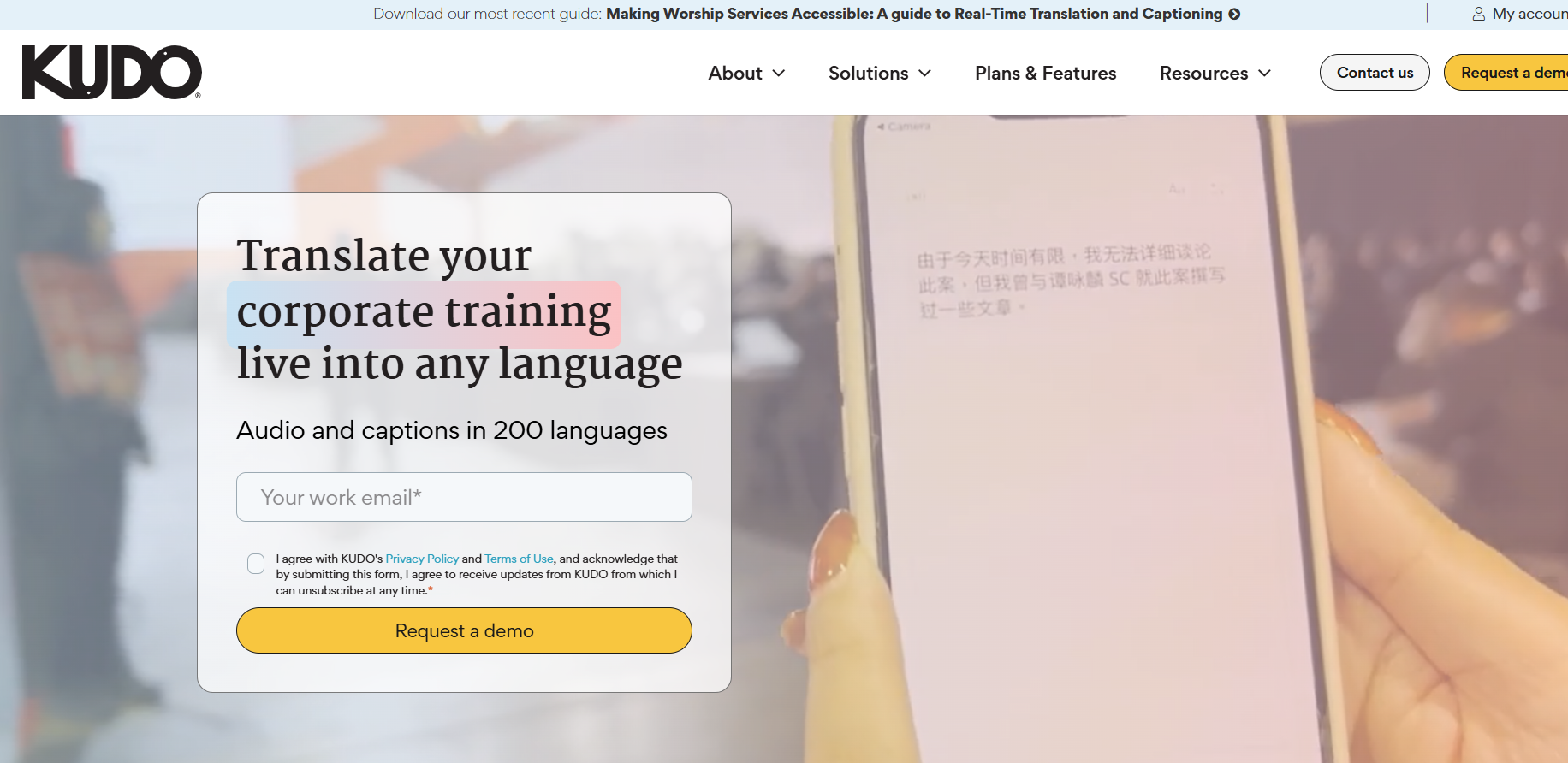 KUDO is an innovative multilingual web conferencing platform equipped with both human and Al- powered live interpretation capabilities. Seamlessly deliver real-time interpretation to enhance the quality of your conferences. The KUDO interpreter marketplace offers a streamlined booking process, granting you convenient access to a vast network of interpreters available on-demand.