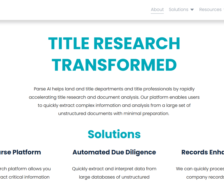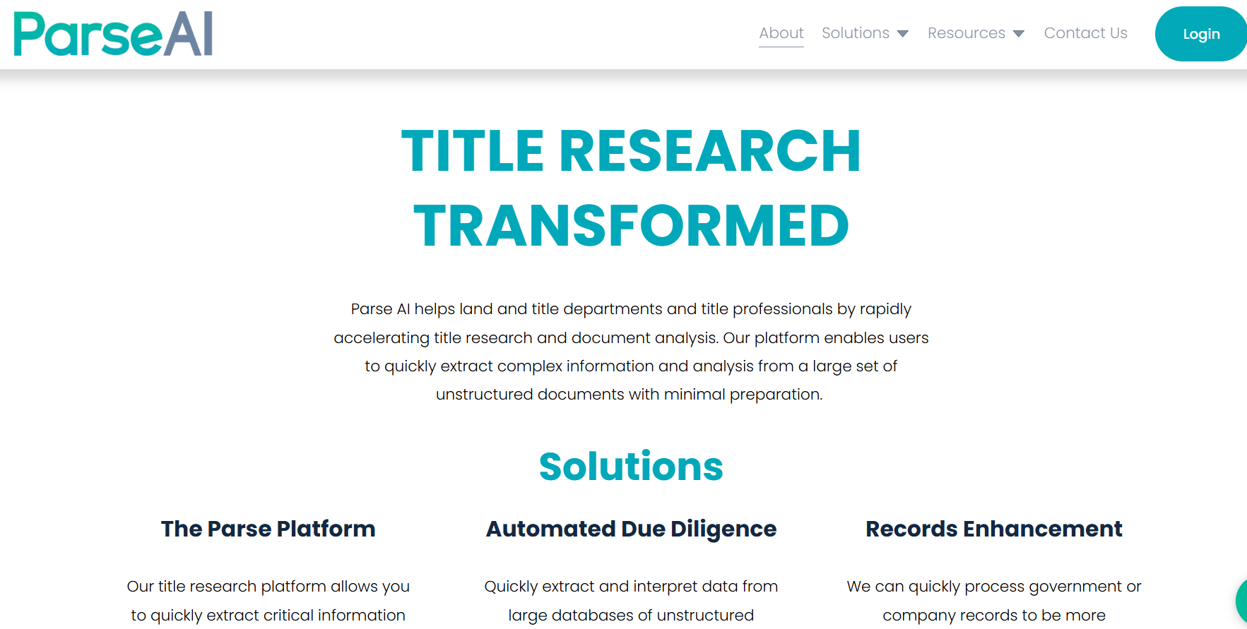 Parse Al brings innovation and speed to real property transactions by leveraging machine learning (ML) and optical character recognition (OCR) to assist with title research. This platform can rapidly extract critical information from a large collection of title documents to allow title researchers to complete abstracts and reports faster and more accurately.